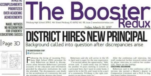 The Booster Redux, the student-run publication at Pittsburgh High School, started out with the goal to write up an introduction for their new principle, Amy Robertson who was hired by the Pittsburg Board of Education on 6 March. While the intent was to inform the student body about the new faculty member, after a few weeks the young reporters quickly realized that something was a little fishy.