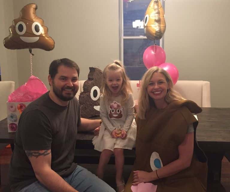 But Audrey wouldn’t budge, and so when her third birthday rolled around Rebecca and her husband decided to “embrace the weird,” she told the Huffington Post, and threw their kid the party of her dreams. Guests at the party enjoyed whoopee cushion party favors and breaking Tootsie Roll- and Hershey’s Kisses-filled poop emoji piñatas. Rebecca even wore a human-size poop emoji costume — Audrey wore a flower-crown-wearing poop emoji sticker on her party outfit.