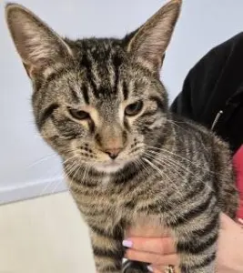 Archie is a 7-month-old black tiger with a sleek coat and a playful, curious spirit. Full of kitten energy, he loves to explore and is ready to become a fun, affectionate companion. Interested? Contact the Blue Water Area Humane Society for more info!